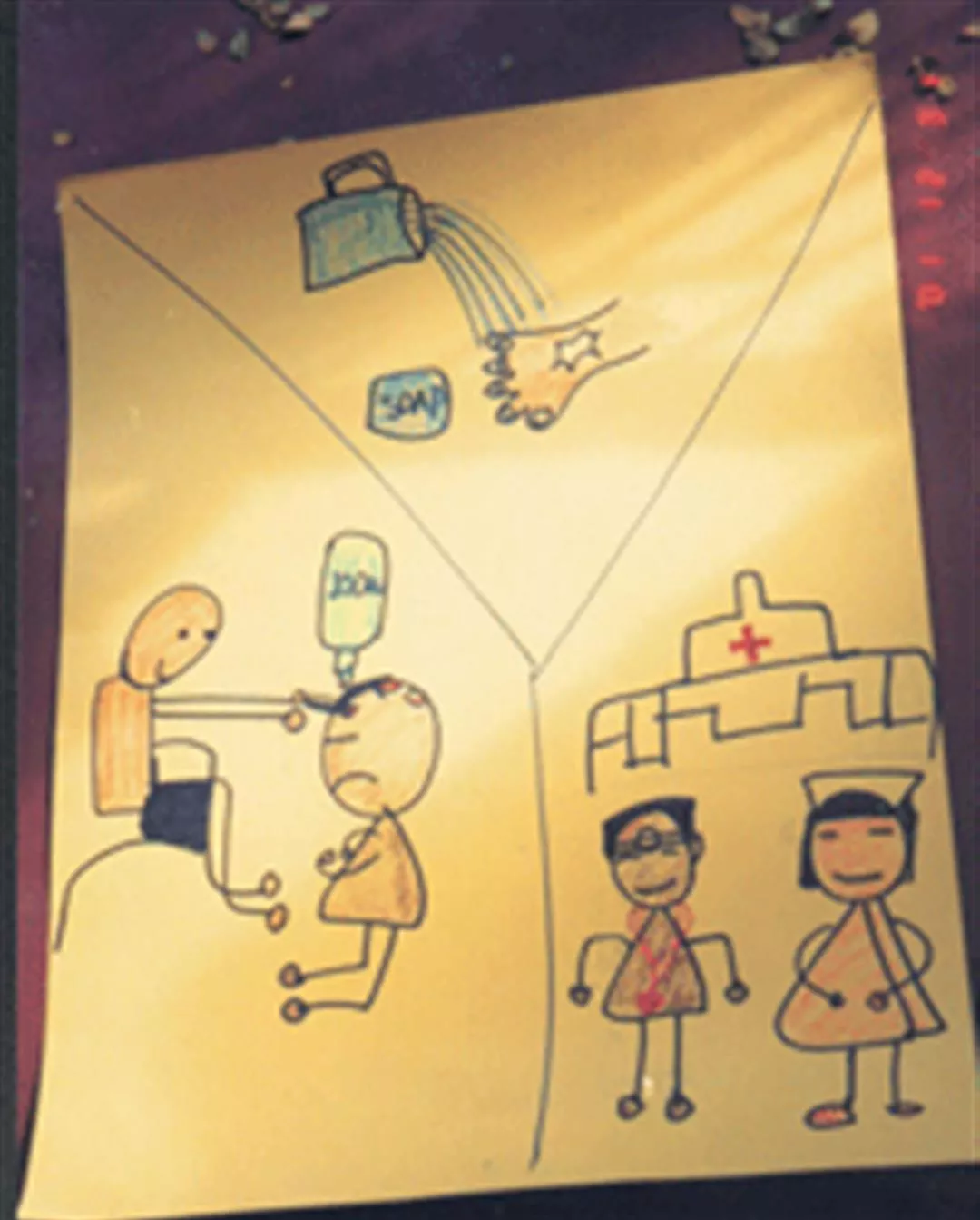 在西藏流亡孩童的畫筆下,台灣醫援人員在當地的義診狀況充滿童趣。(台灣國際醫療行動協會提供)