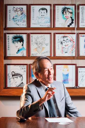 在擺著藤子不二雄、鳥山明等漫畫家簽名的透明櫥窗前,東立出版社創辦人范萬楠拿起畫筆比劃兩下,馬上流暢的在白板上,畫下一幅男子的漫畫肖像。40年前輟筆,退居二線成為出版推手後,他的漫畫功力絲毫沒有減弱。