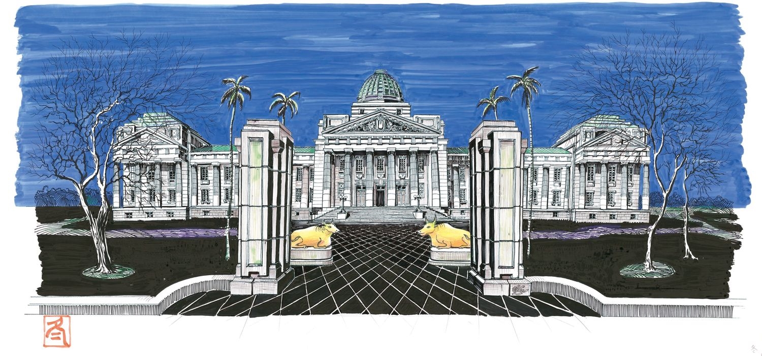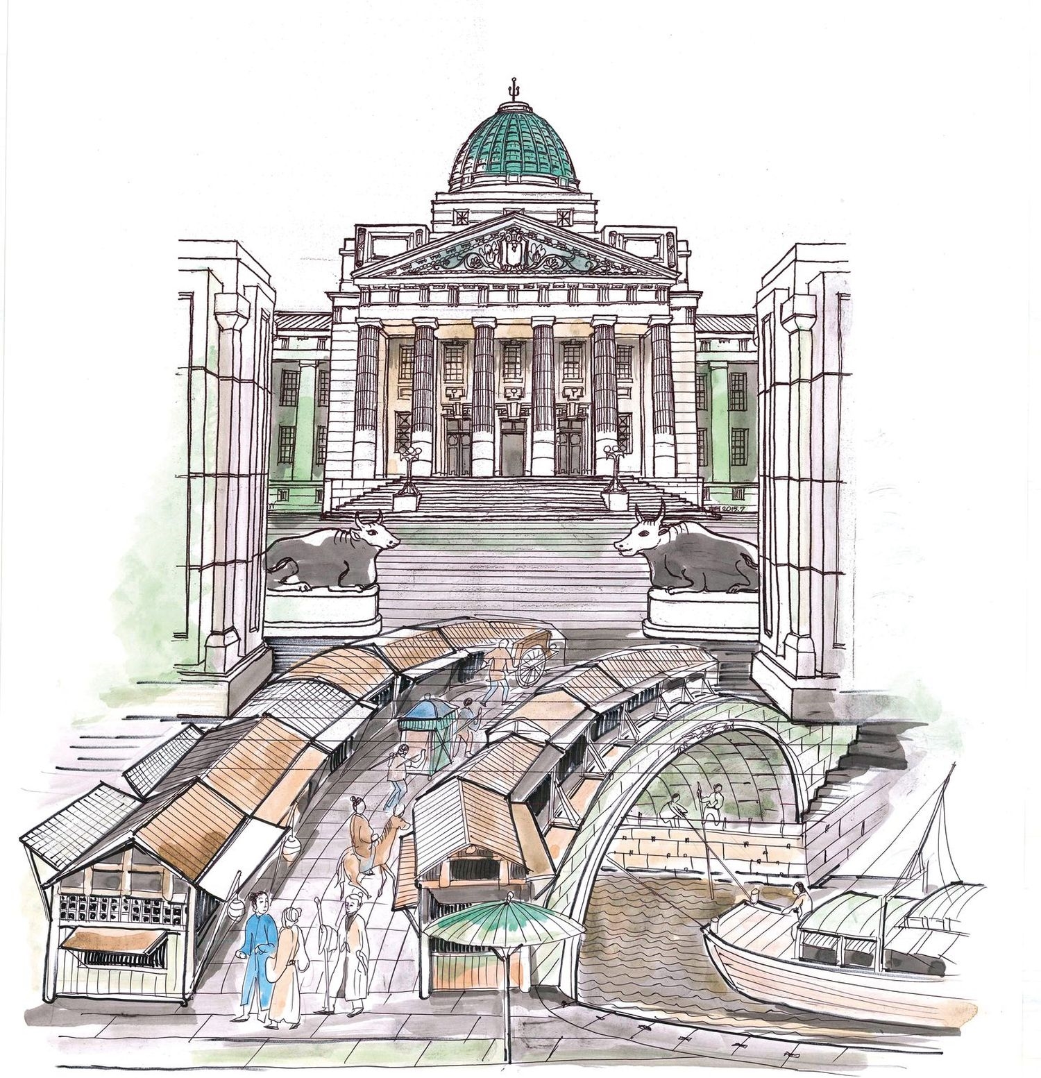 想為建築圖帶入文學情境的想像,他參考日本浮世繪畫家安藤廣重的〈大橋驟雨〉,將驟雨與拿著油紙傘的行人放入臺博館前的廣場,讓觀者如同身歷其境在淅瀝淅瀝的大雨中淋濕了鞋襪;把〈清明上河圖〉裡的虹橋搬到臺博館前,畫中彷彿聽得見市囂的喧鬧。李乾朗說,臺博館建造的年代,西方正盛行新藝術主義,他擬想著把台灣雲豹、藍鵲入畫,再將黃牛替換成台灣的水牛,邊框以花紋為飾,成為一幅慕夏風的臺博館。