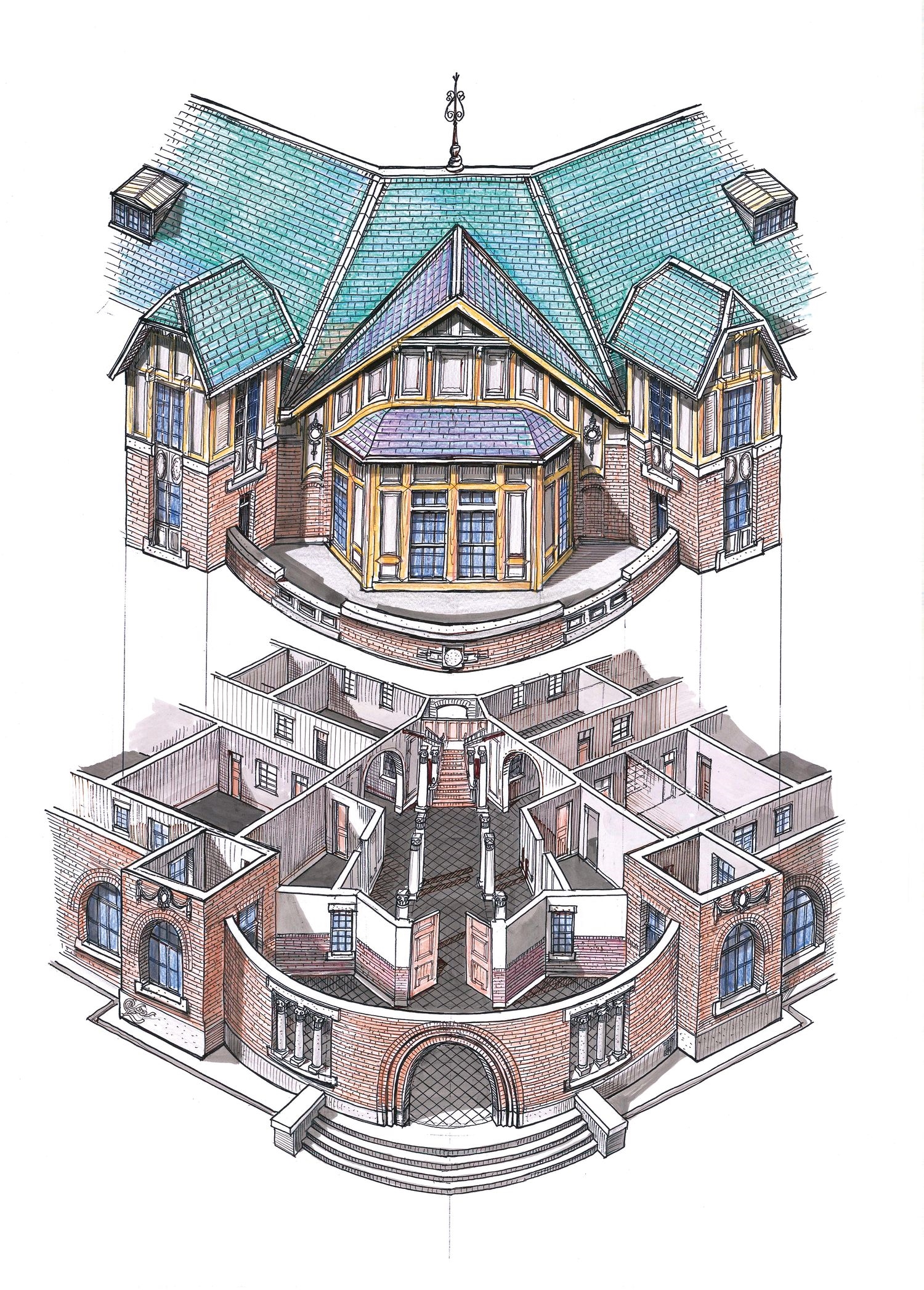 建築圖是建築系學生的基礎訓練,每個月要畫上數十張不同視角的建築圖,李乾朗自幼的美術基底深厚,畫建築圖並非難事,但為了呈現更多細節,他不厭其煩的修改視角與呈現手法,採用了不同消點的透視圖、等角透視圖、剖面圖、分解圖等,從構思草圖、上色、添補細節、增添光影效果,一筆一筆的畫出臺博館百年的世紀風華。