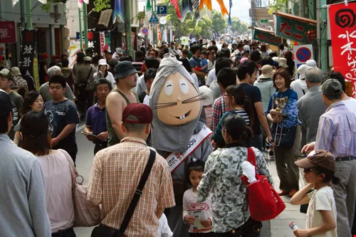 「妖怪」聚集的境港市,已成為日本最受歡迎的旅遊景點之一。左為鬼太郎銅像,右為遊走市街帶動氣氛的鼠男觀光大使。