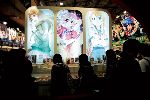 無論出版產業遭遇什麼瓶頸,台灣仍有廣大的死忠漫畫讀者。圖為動漫界的年度盛事「漫畫博覽會」,2010年6天展期吸引54萬人次前往,打破歷屆紀錄。右圖為林珉萱作品《年上年下》。