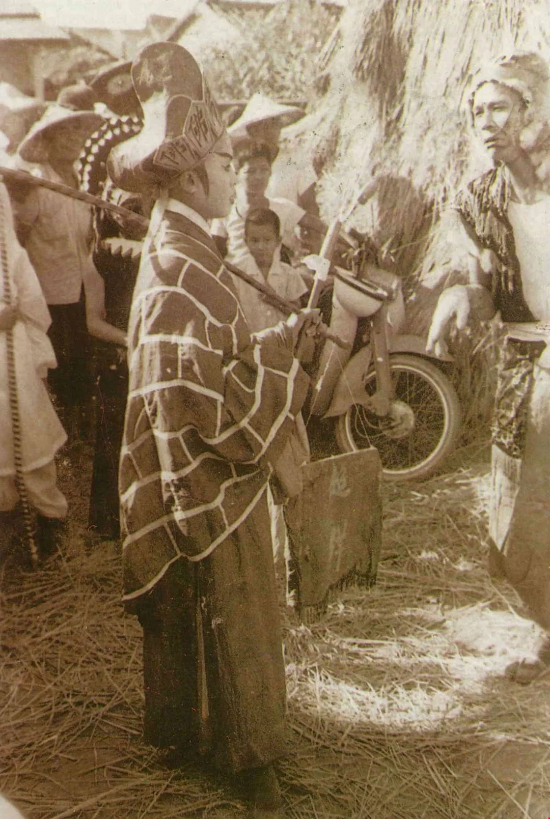 民國二、三十年前,農村盛行「落地掃」-不搭戲台,隨處可開鑼的演出型式。圖為江清柳(圖右扮孫悟空者)和大女兒素雲演出「濟公傳」。(江清柳提供)