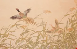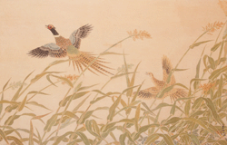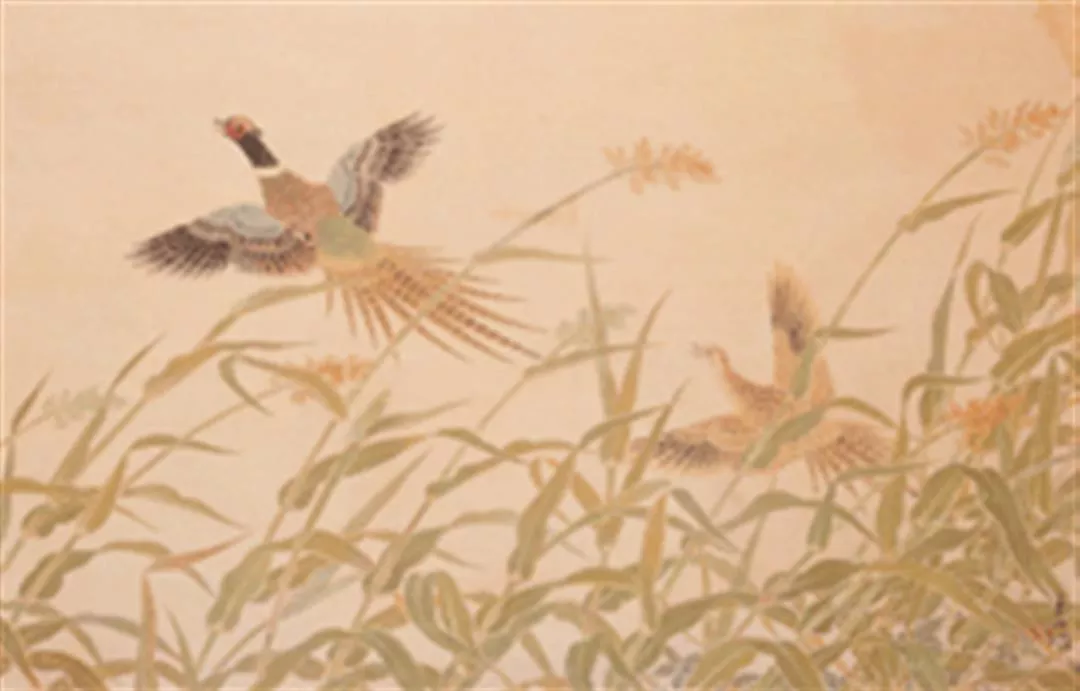 熱愛寫生與動物的林玉山,以彩筆留下了許多台灣稀有動物最自然美麗的身影。這張《錦翼迎風》裡展翅高飛的就是環頸雉。