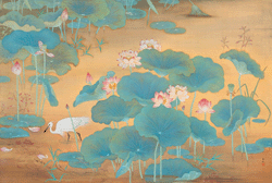 清晨沁涼的微霧中,一朵朵荷花慢慢地綻放,「好像可以聽到花苞張開的聲音,」林玉山形容。回家後,林玉山向朋友家借來寬敞的空間,將巨幅的絹布鋪在地上,彎著腰蹲坐在地上,一筆一筆作畫。畫面上,調進三十多包金粉的底色,呈現出一片金黃晨光,水池上,石青色的荷葉盛展,脂紅色荷花乍開,一隻白鷺穿梭其間低頭覓食,為柔靜的蓮池帶來一股鮮活的生命躍動。