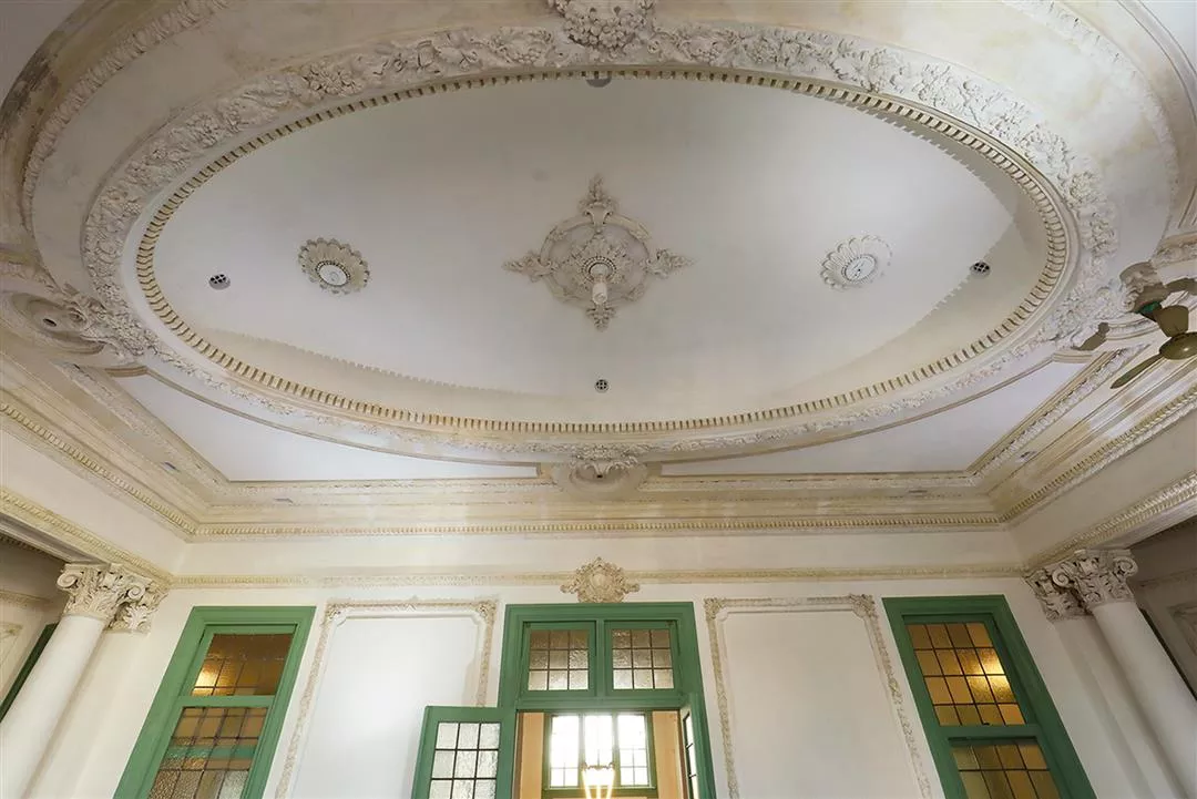 鐵道部二樓的花廳,天花板上橢圓形巧緻精美的灰泥雕塑,顯示其官方廳舍的講究與氣派。
