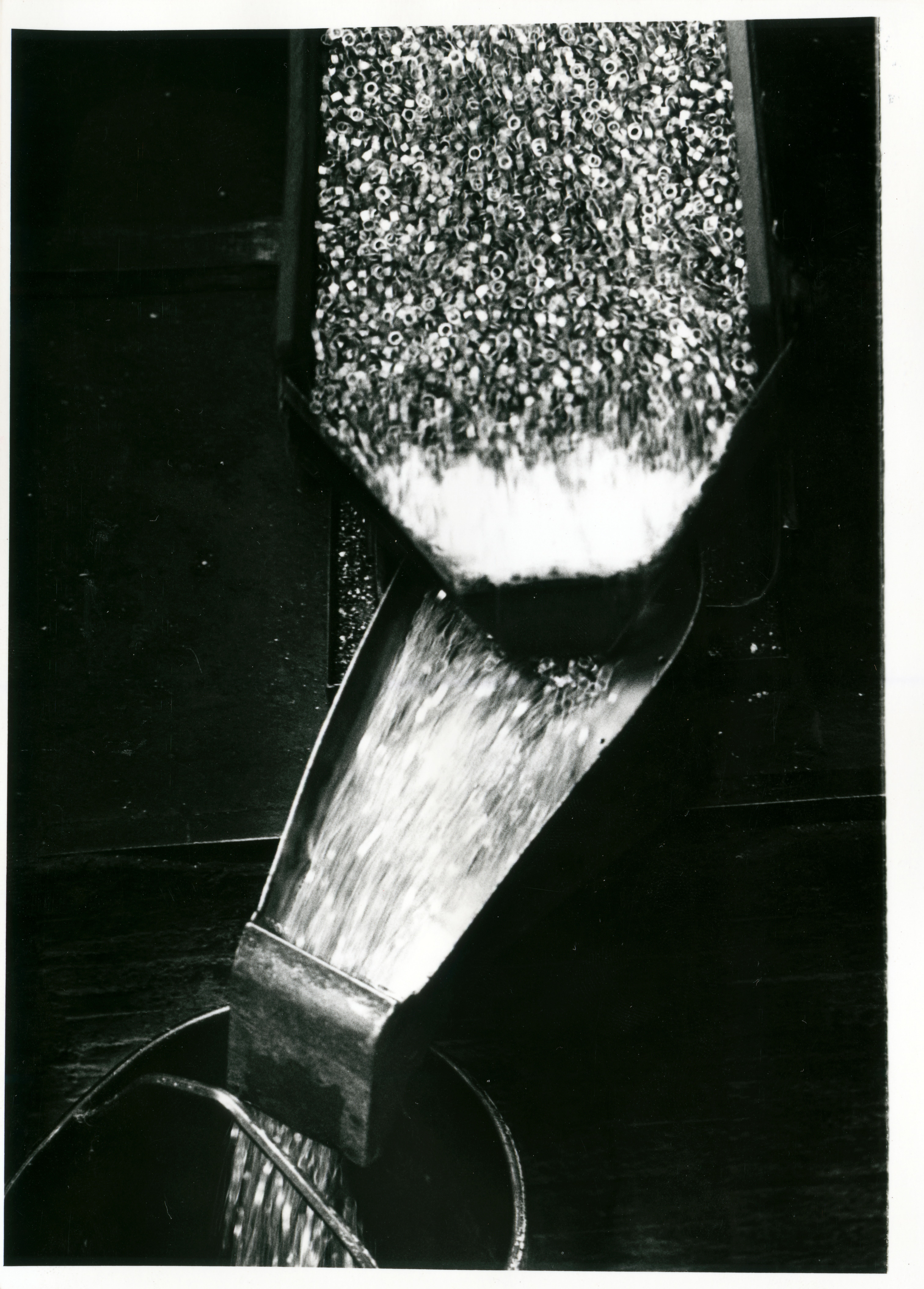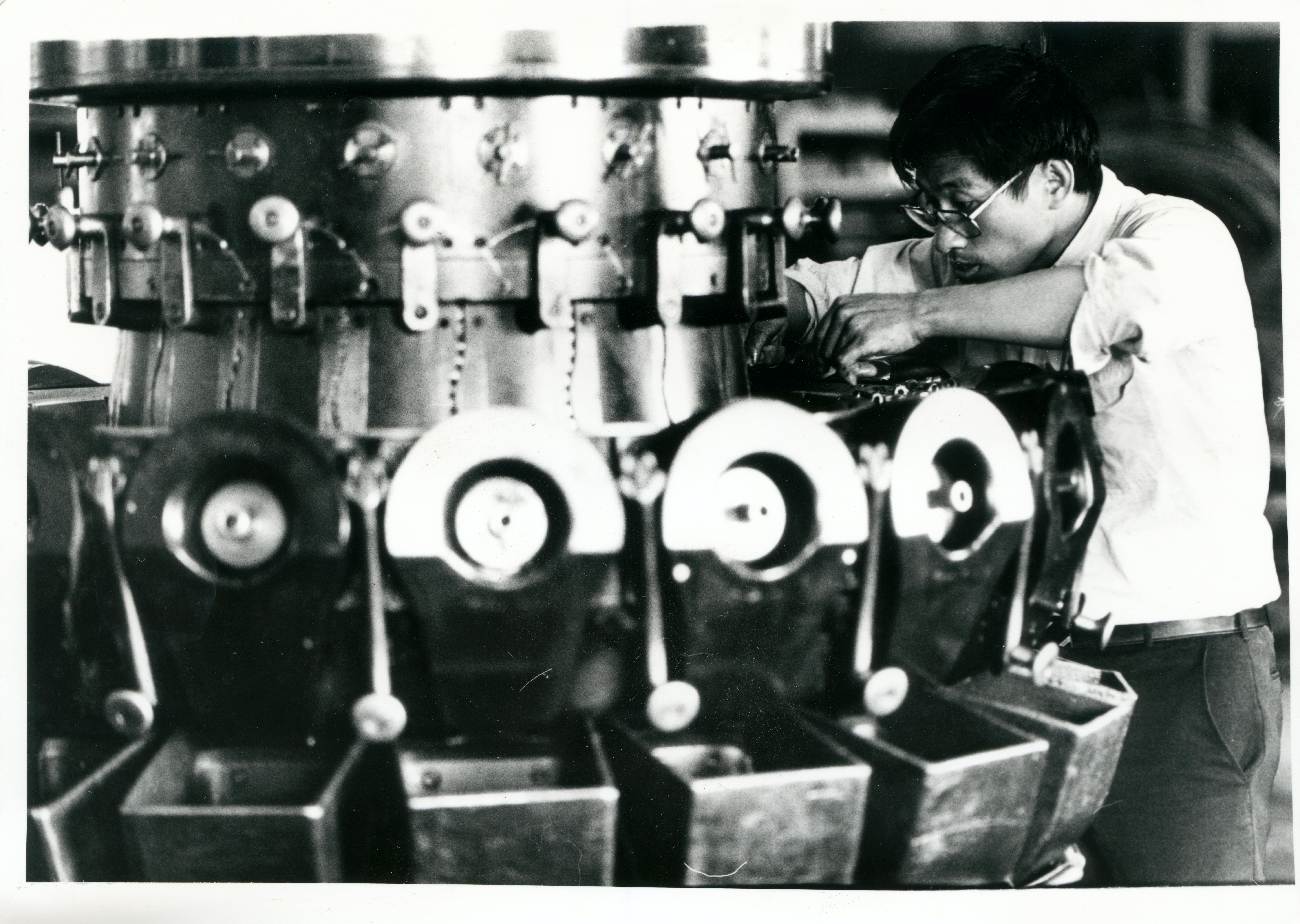 李淵河的第四代螺帽成型機,每分鐘生產一千粒螺帽。這是個世界紀錄。(邱勝旺)