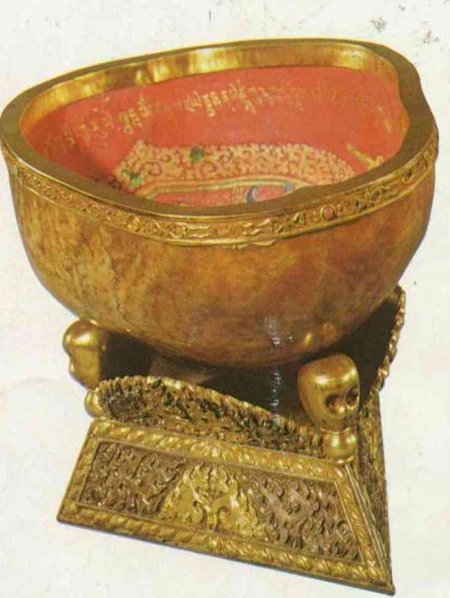 「嘎布拉」是梵文譯音,義即顱骨。圖左祭器為密宗修行時作法之用,高14.4cm,長18.3cm,寬14.6cm。由於是清宮用品,裝飾格外考究:顱骨邊緣鑲鍍金口,外沿鐫刻蟠枝花,上鑲三色石珠,內壁則襯以紙地,上繪佛像,寫滿經文。