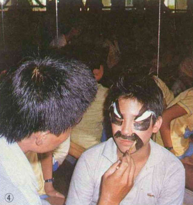 「國劇欣賞」課程,孩子最欣賞的是「身段武功教做」。看老師翻身、踢腿、連續翻觔斗,他們都興奮地拍手叫好。但有些比較細膩的動作,他們就不懂了。例如老師比劃手勢、表演開門的動作,臺下會突然冒出一句:「What's that?」這時老師得詳加解說,並鼓勵他們試著學做。