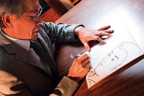 在擺著藤子不二雄、鳥山明等漫畫家簽名的透明櫥窗前,東立出版社創辦人范萬楠拿起畫筆比劃兩下,馬上流暢的在白板上,畫下一幅男子的漫畫肖像。40年前輟筆,退居二線成為出版推手後,他的漫畫功力絲毫沒有減弱。