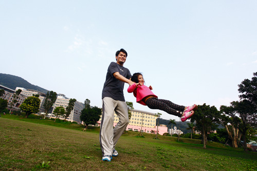 假日爸爸帶著小孩到公園玩耍,木頭人、躲貓貓、快樂旋轉,遊戲中也不知不覺達到感統訓練的效果。