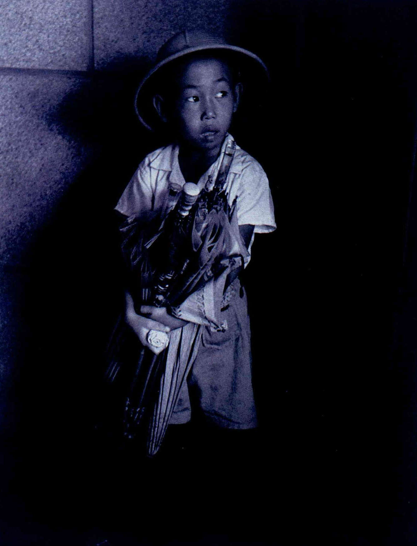 「小學童」(一九六○年)這幅作品中,我們看到昔日的家鄉學童站在角落中憨怯的斜著雙眼凝視,他抱著一堆雨傘不知在做什麼?但那付神情打扮隱約中已勾起我們久遠的兒時記憶。