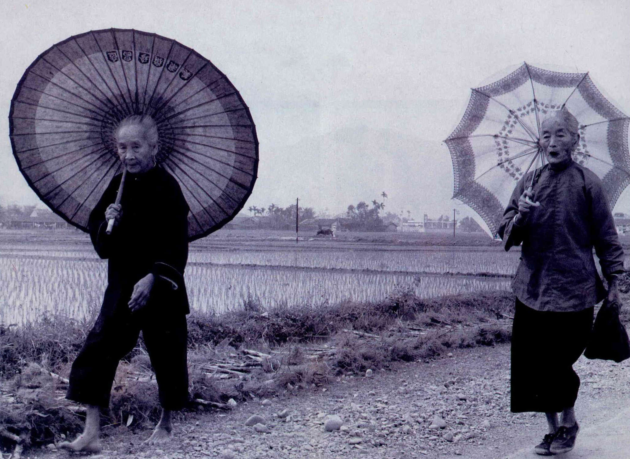 「兩老婦人」(一九六一年)表現了美濃老婦勤勞樸實的作息樣貌。油紙傘與洋傘、赤足與布鞋、踩在柏油路面與粗礫石粒上的腳……均形成有趣的對比,而相似的是她們仍然硬朗,不屈的身軀與神態。它似乎亦提示著,歲月滄桑在鄉居生活的印證上,做為女性者,其身心的健康持續要比男性更堅韌而長久罷。