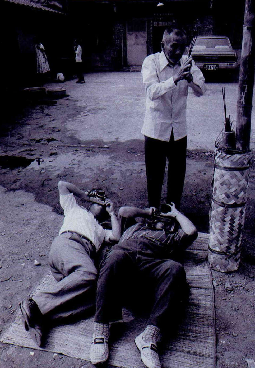 在「街道占卜師」(一九六三年)的作品中,我們看到六○年代最簡單、樸拙的庶民生態。老婦人的坐姿與占卜師回首一望的神情,生動簡明的交待了生活的游離與命運的苦澀,然而他們兩人似乎藉著對命相的告解與預言,來克服未來日子的顛沛不安。牆邊上的燈籠、雨傘、木桌、石塊、拖鞋等,似乎已然成為久遠的存活象徵。