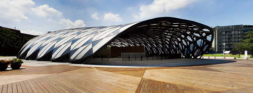 至於「行動巨蛋」,則是台北花博676場藝文活動展演的空間,採無樑柱挑高設計,並以易拆卸結構組成,可以將佔地約3個籃球場大的建物,在8小時內完成拆卸與存放。