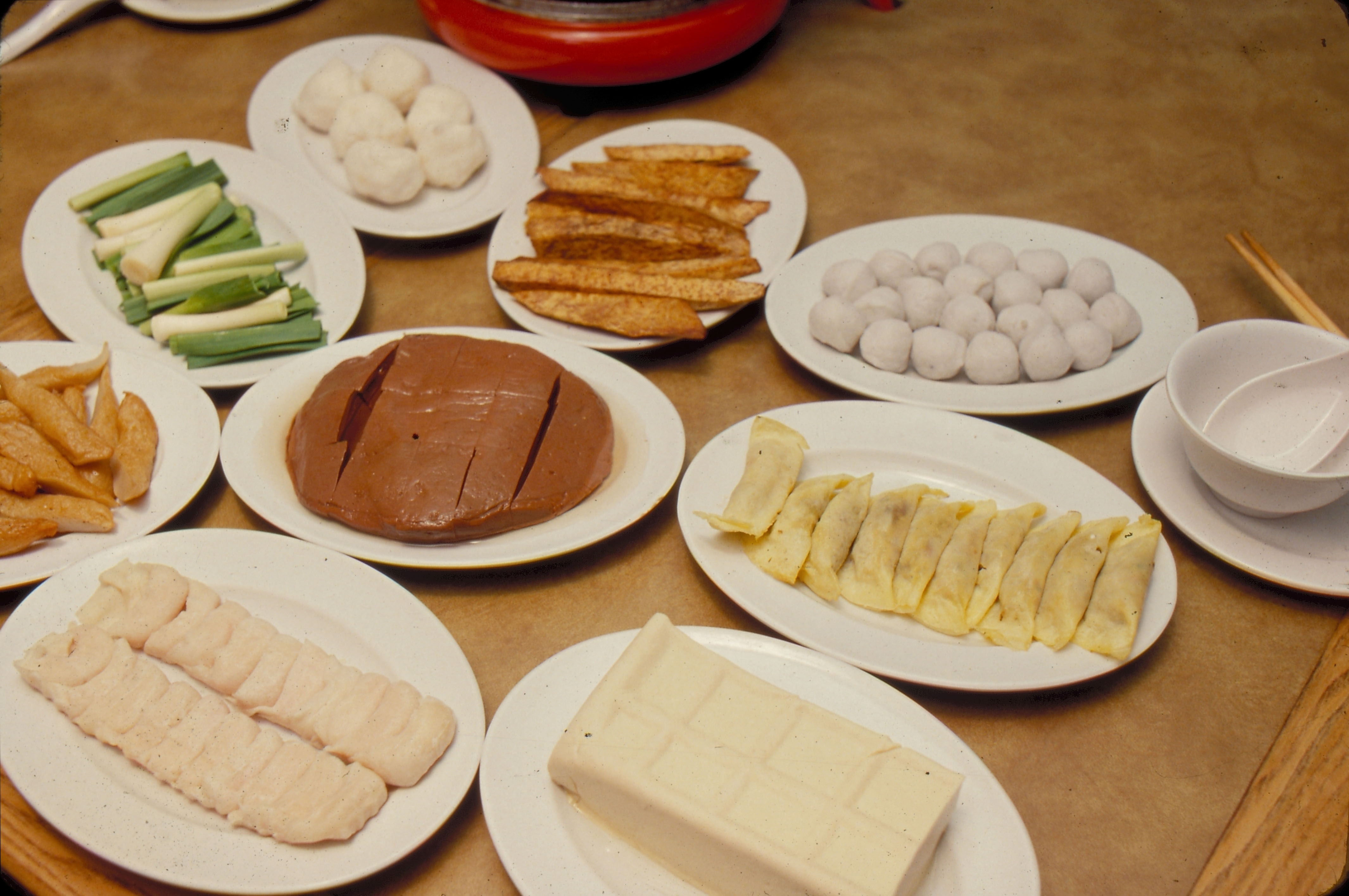 豆腐和粉絲也是吃火鍋必備的妙品。這兩種東西本來都淡而無味,加在火鍋中,卻能吸取湯中之精華。尤其是凍豆腐中有細洞,更能完全吸收湯味,在口中輕輕一咬,汁液乍流,美味無比。豬血和鴨血如果做得好,也有和豆腐同樣的奇效。粉絲由於水份吸得多,通常都在最後才擺到鍋裡,大家連粉絲帶剩湯分而食之。購買粉絲時要選擇耐煮的,以免下鍋不久就溶化掉了。