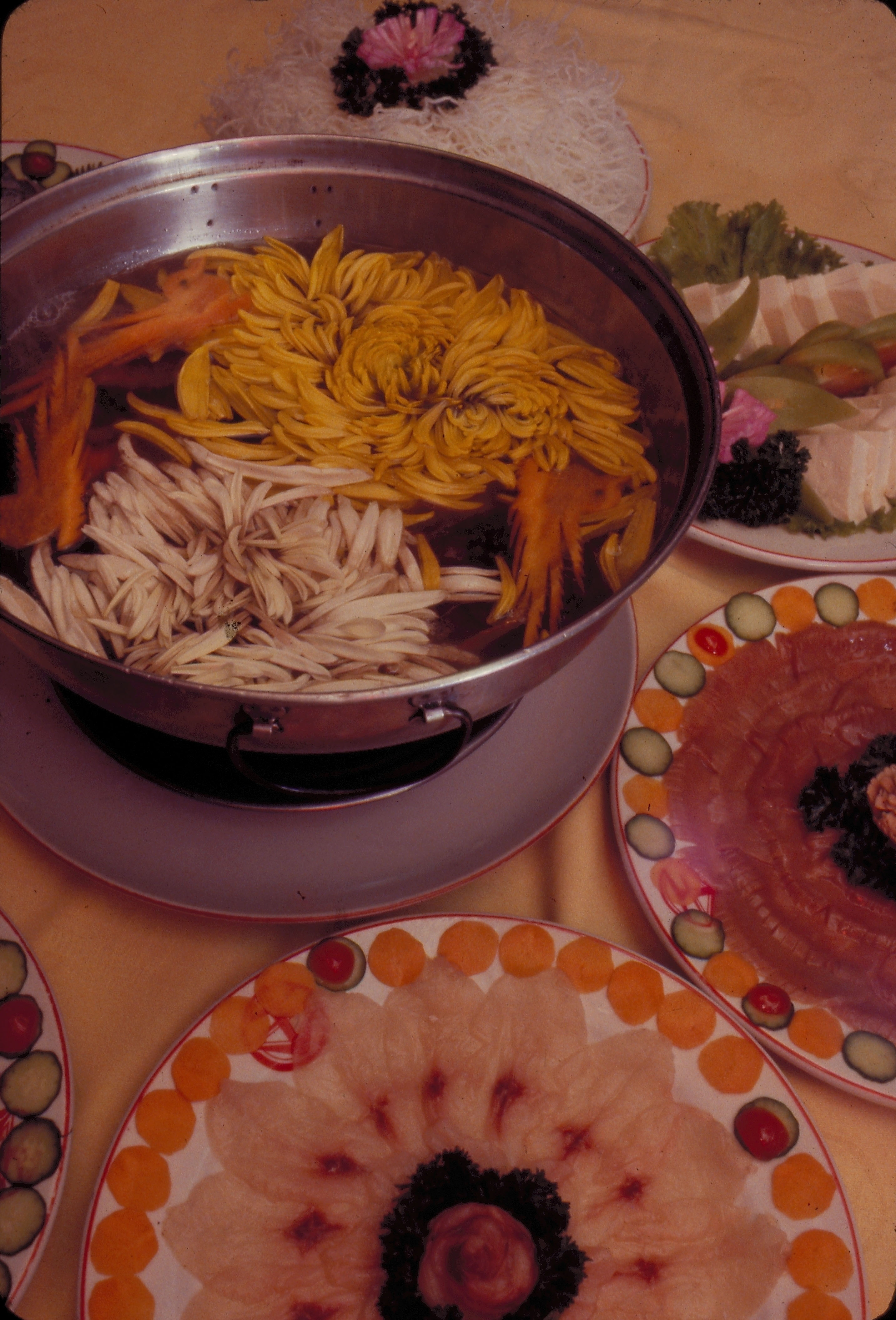 菊花火鍋的材料都是切得極薄的生片,在盤內擺成菊花狀。火鍋內撒點菊花瓣,取菊花的清香。(歐陽芷汀)